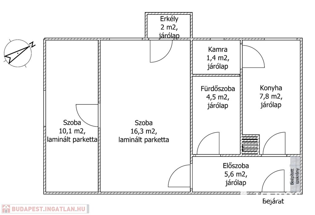 A padlóburkolat laminált parketta, valamint a nagy szobában linóleumos melegburkolat.