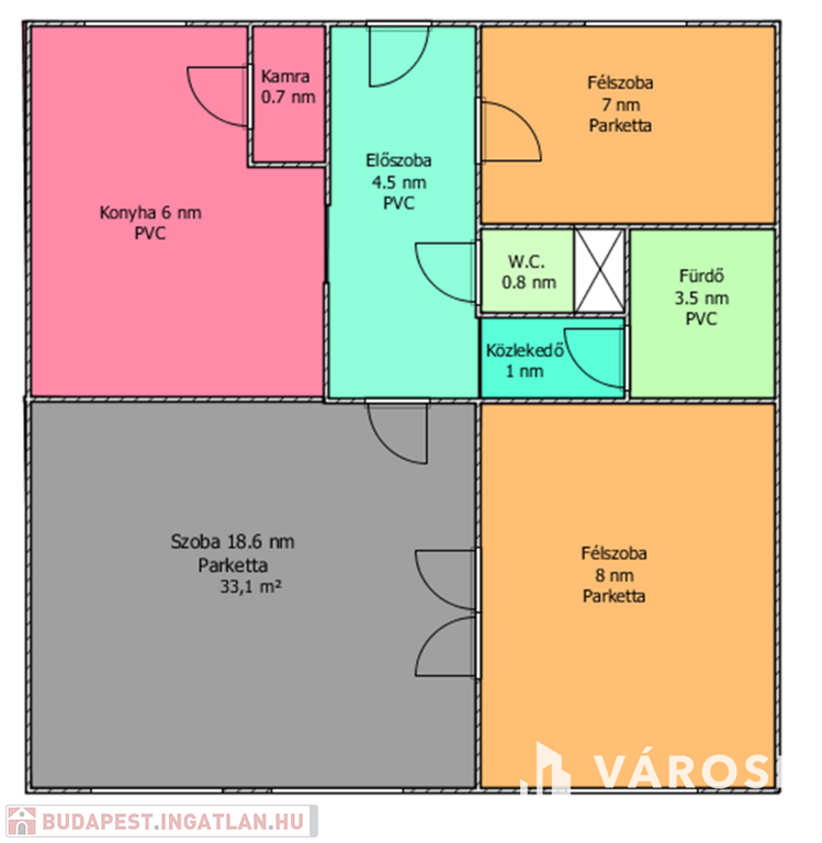 Az ingatlanban 1 szoba, 2 félszoba, konyha, kamra, előszoba, fürdőszoba, külön nyíló W.C. található.