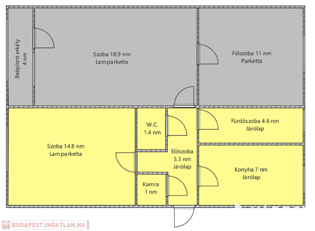 Helyiségei: 2 szoba, 1 szoba, konyha, kamra, előszoba, fürdőszoba, külön nyíló W.C., beépített erkély.