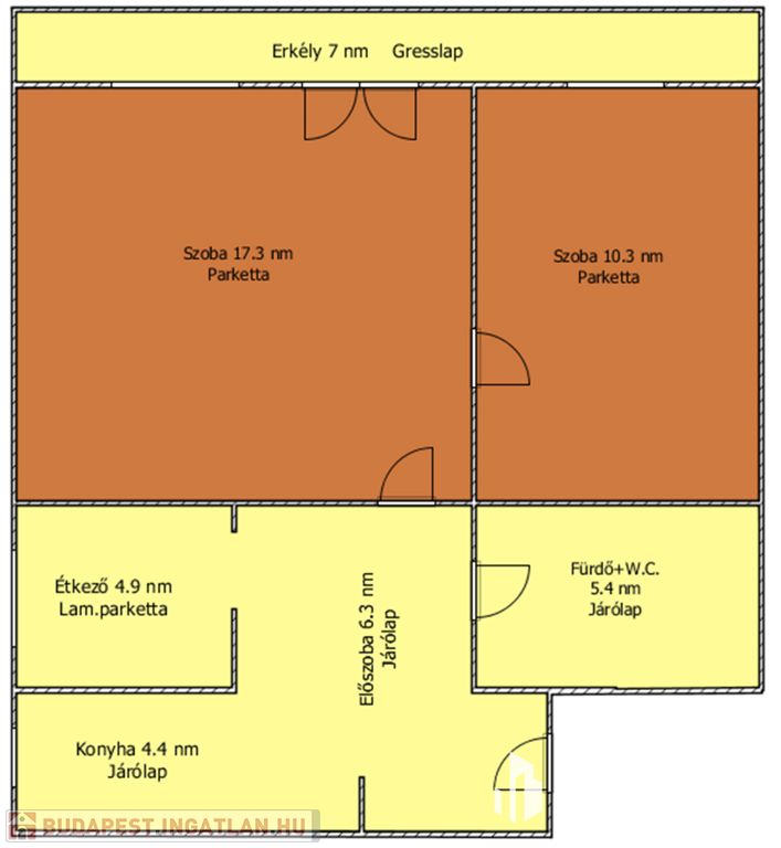 Helyiségei: 1 szoba, 1 félszoba, konyha, étkező, előszoba, fürdőszoba, erkély.