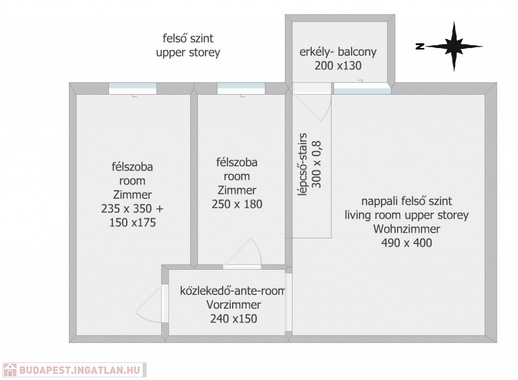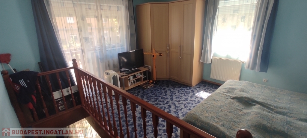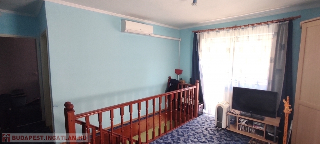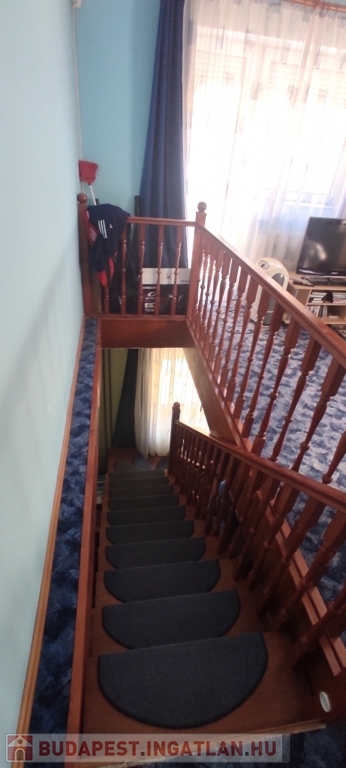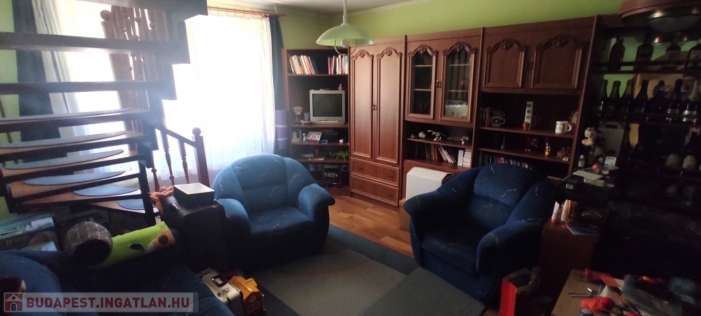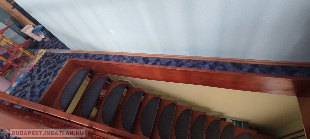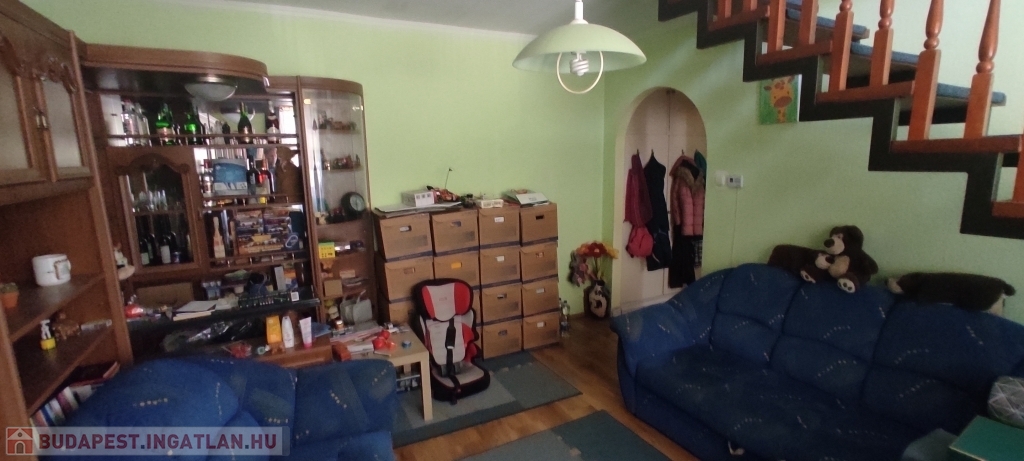 A lakás bejárata a magasföldszinten van, a felső szintre az alsó nappaliból nyíló lépcsőn lehet felmenni.