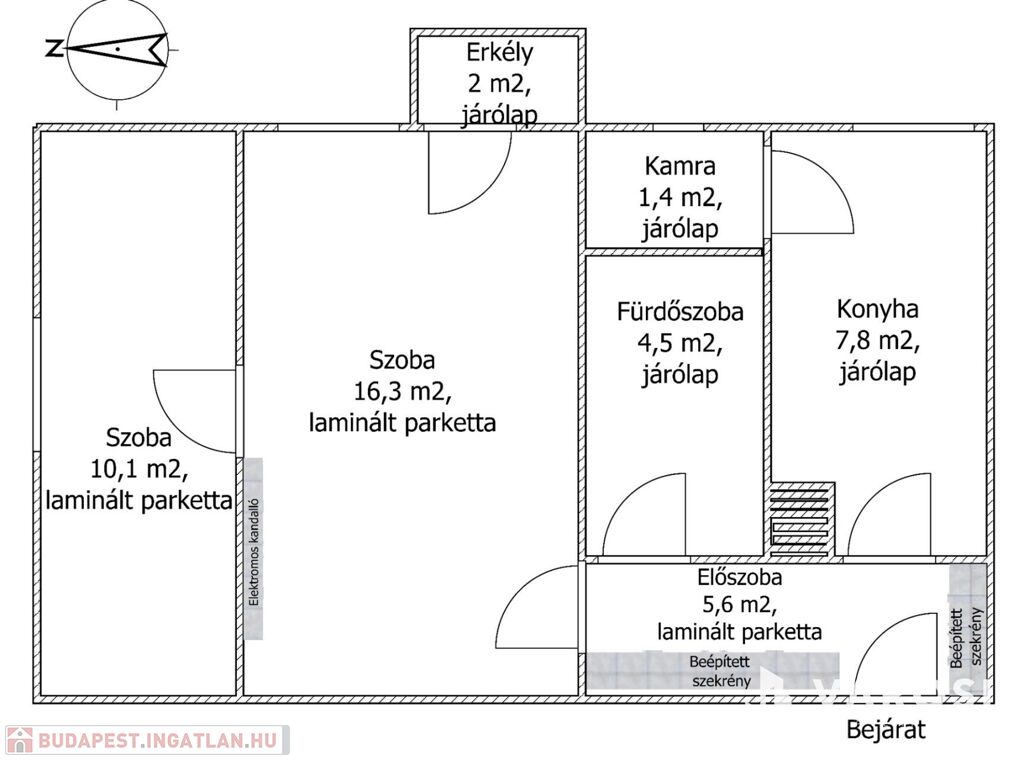 A padlóburkolatok laminált parkettás, és járólapos kivitelűek.