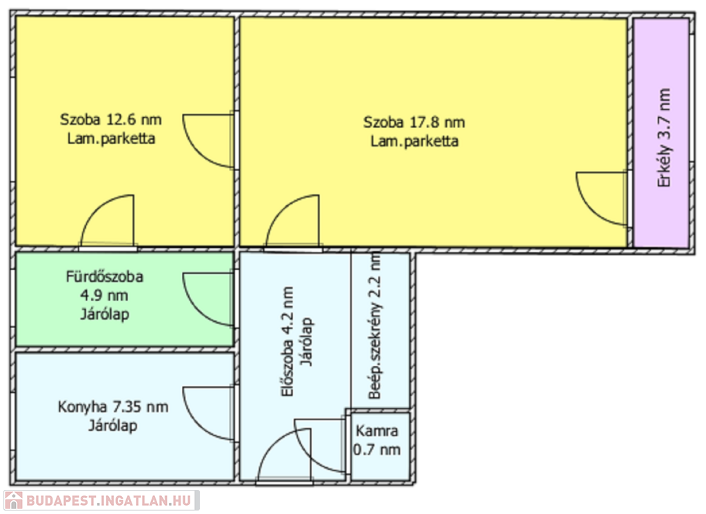 Helyiségei: 2 szoba, konyha, kamra, előszoba, fürdőszoba, erkély.