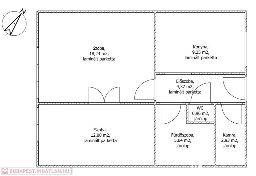 A padlóburkolat a szobákban, az előszobában, és a konyhában laminált parketta,