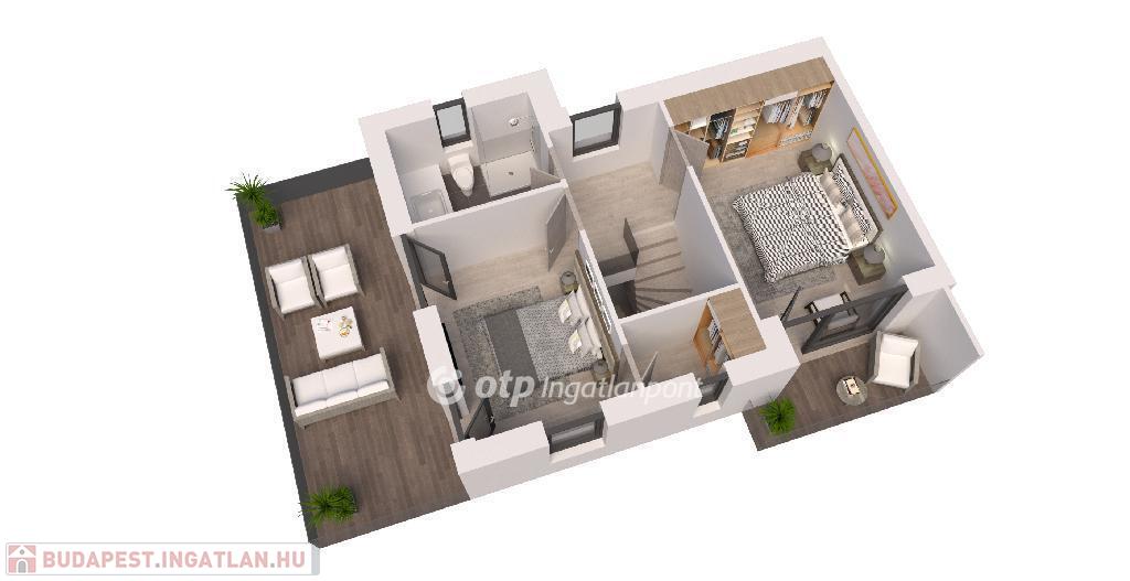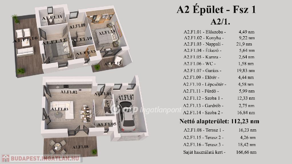 A földszinten található a tágas nappali, a garázs és egy 16,23 nm terasz, amely közvetlen kertkapcsolattal rendelkezik. Az emeleten kapott helyet a két hálószoba, két fürdőszoba és két különálló terasz(4,26 és 18,42 nm), amelyek biztosítják a kellemes pihenést.