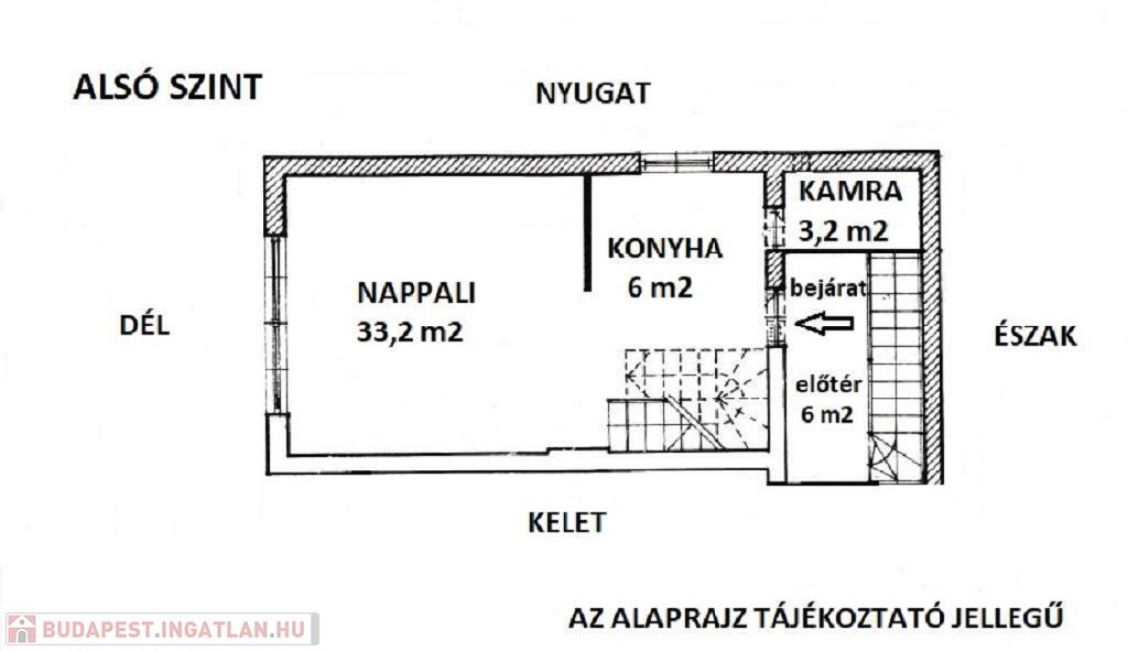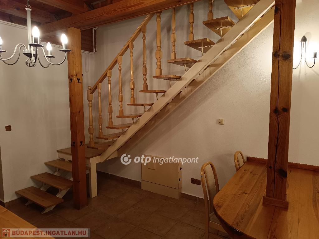 A lakás bejárata az 1. emeletről nyílik. Az alsó szinten egy világos, amerikai konyhás nappali kapott helyet külön kamrával, míg a felső szinten egy nagy, akár két kisebb szobára bontható helyiség, egy további hálószoba, valamint egy kádas, WC-s fürdőszoba található.