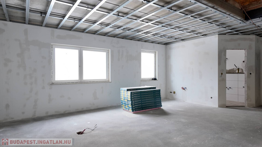 A BELSŐ 2 SZINTES lakás alsó szintje (47 m2) egy nappali + 1 hálószobával és zuhanyzós fürdőszobával készül, valamint tartozik hozzá egy tetőtéri rész, melyhez a kivitelező lépcsőt épít, itt kialakítható további 2 szoba, vagy 1 nagyobb közösségi helyiség.