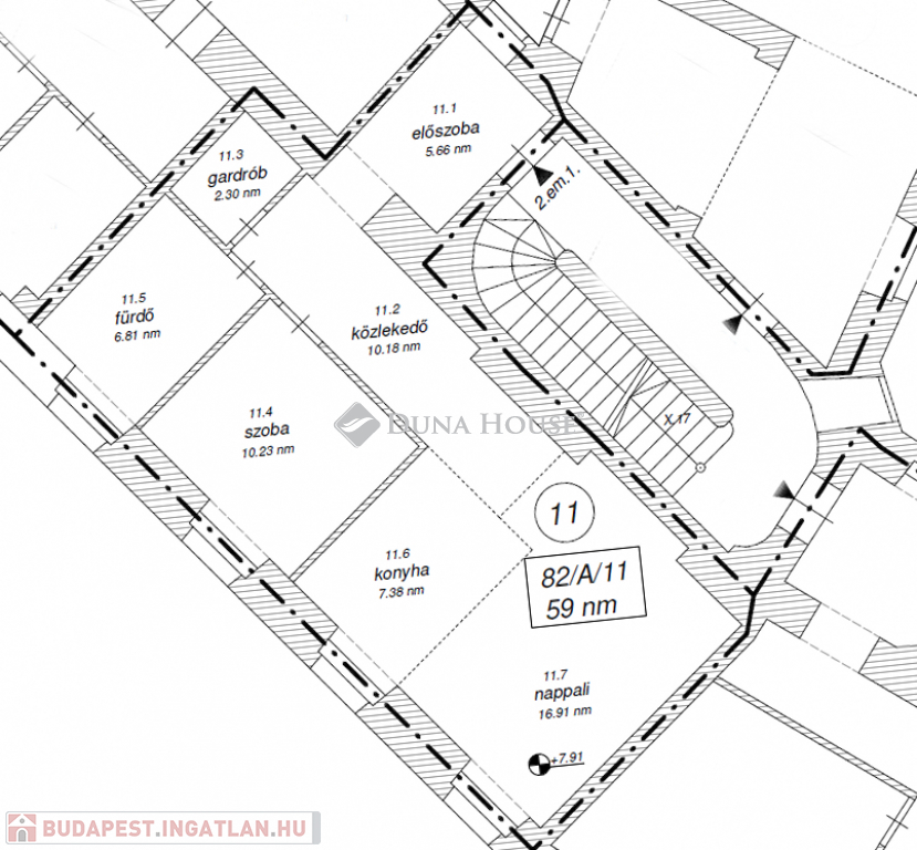 A 11 lakás: A második emeleti ingatlan 59 m2 alapterületű, amerikai konyhás nappali, egy hálószoba, gardrób és fürdőszoba kapott helyet benne, a hangulatos lakás tágas, világos, délnyugati tájolású, kilátással a sétáló utcára...
