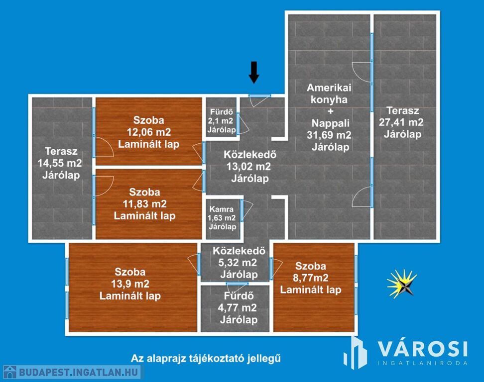 A lakás 1 db amerikai konyhás nappalival, 4 db hálószobával, 2 db fürdőszobával Wc-vel, közlekedővel, előtéttel, dupla terasszal rendelkezik.