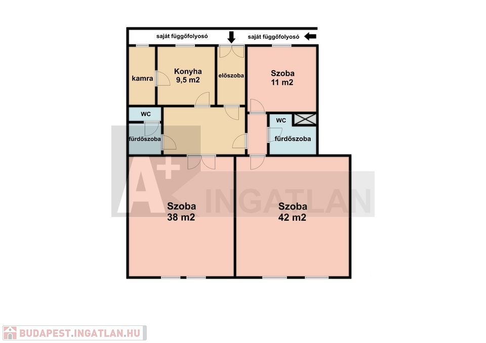 A 3 nagyméretű szoba praktikusan külön bejáratú. A lakásban 2 fürdőszoba is rendelkezésre áll, az egyik kádas, a másik zuhanyzós kialakítással.