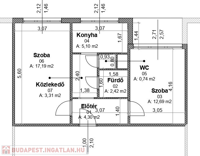 Az ingatlan a kedvelt elrendezésben található. Két külön bejáratú szoba. Közlekedő, fürdő wc-vel és konyha.