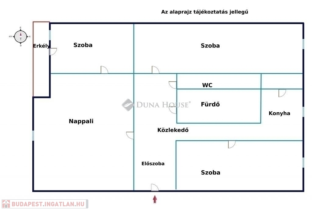 - 3 különnyíló szoba, előszoba, közlekedő, konyha, fürdőszoba és WC