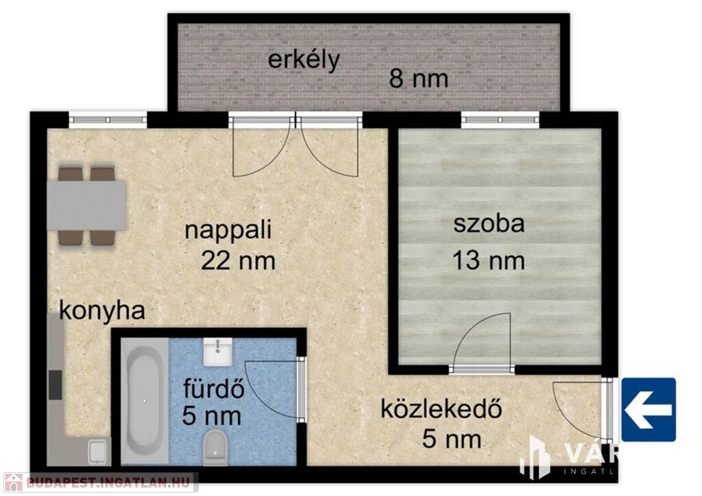 - Amerikai konyhás nappali + 1. szoba, fürdő, erkély.