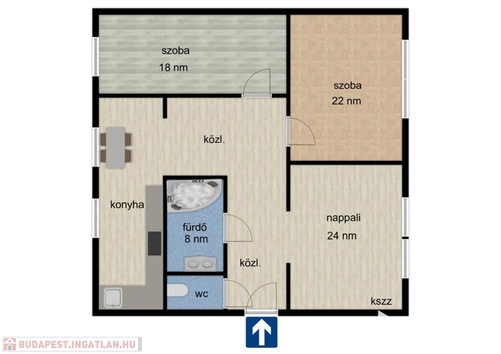 - Nappali + 2 szoba, konyha fürdő, WC, közlekedő.