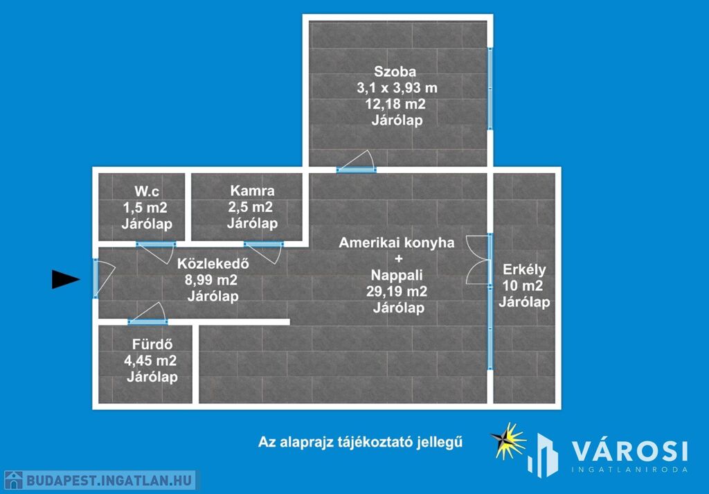 A lakás 1 db amerikai konyhás nappalival, 1 db hálószobával, 1 db fürdőszobával, külön Wc-vel, közlekedővel, erkéllyel rendelkezik.