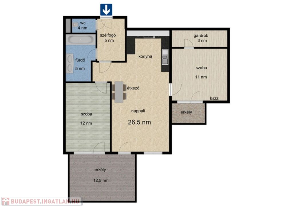 - 63,68 nm hasznos alapterület.+ 12,05 erkély.