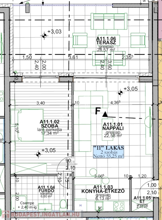 Elrendezés: konyha + étkező – nappali, szoba, előtér, fürdő/wc egy helyiségben, terasz: 28,57nm