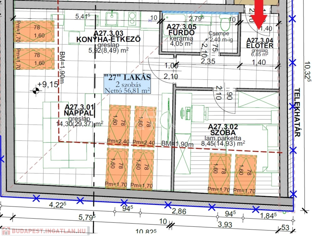 A27 lakás: 74,45 m2|konyha + étkező - nappali, 2 hálószoba, előtér, fürdő + wc, különálló wc