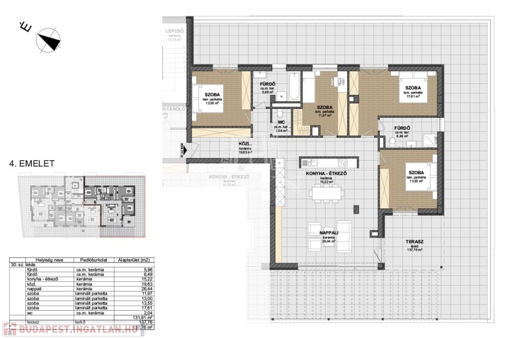 30 lakás: 131,91 m2|konyha + étkező + nappali, 4 hálószoba, közlekedő, fürdő + wc, 1 fürdő, wc terasz: 137,76 m2 Eladási ár: 169.000.000,- Ft