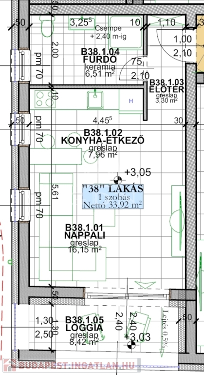 Elrendezés: konyha + étkező - nappali, előtér, fürdő/wc egy helyiségben, terasz 8,42nm