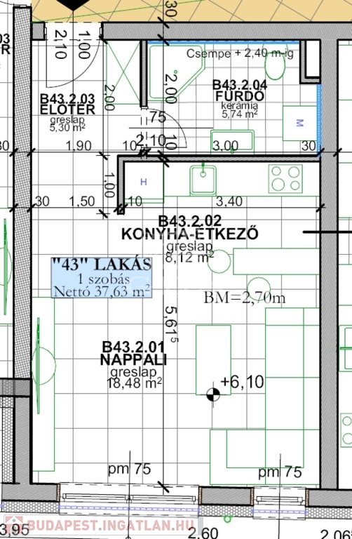 Elrendezés: konyha + étkező - nappali, előtér, fürdő/wc egy helyiségben