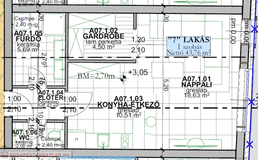 Elrendezés: konyha + étkező – nappali, előtér, gardrób, fürdő, wc külön helyiségben