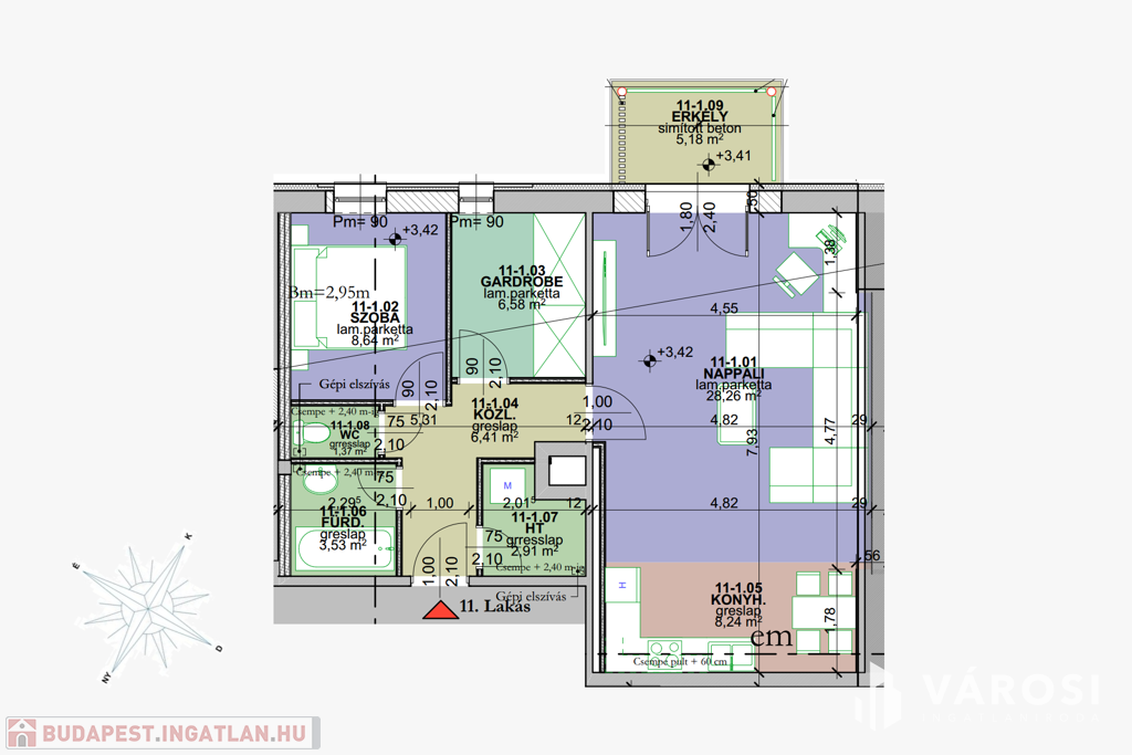 Az emeleten levő 65,94 négyzetméteres 11. lakás a következő helyiségekkel kerül kivitelezésre: nappali, szoba, konyha, gardróbszoba, háztartási helyiség, fürdőszoba és egy 5,19 négyzetméteres erkély. Ára: 71 684 550 Ft.