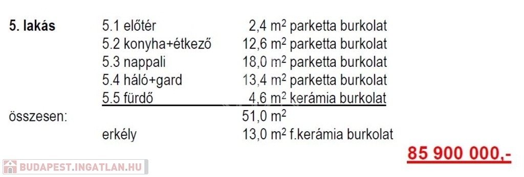 A lakás alaprajza és a helységek listája a képek között megtalálható.