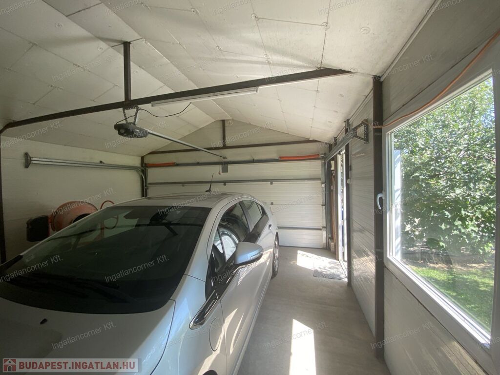 A kert végében egy dupla garázs, szekcionált , elektromos ajtóval, hatalmas ablakokkal.Hozzáépítve egy télikert, ahol a kényesebb növények kitelelnek.
