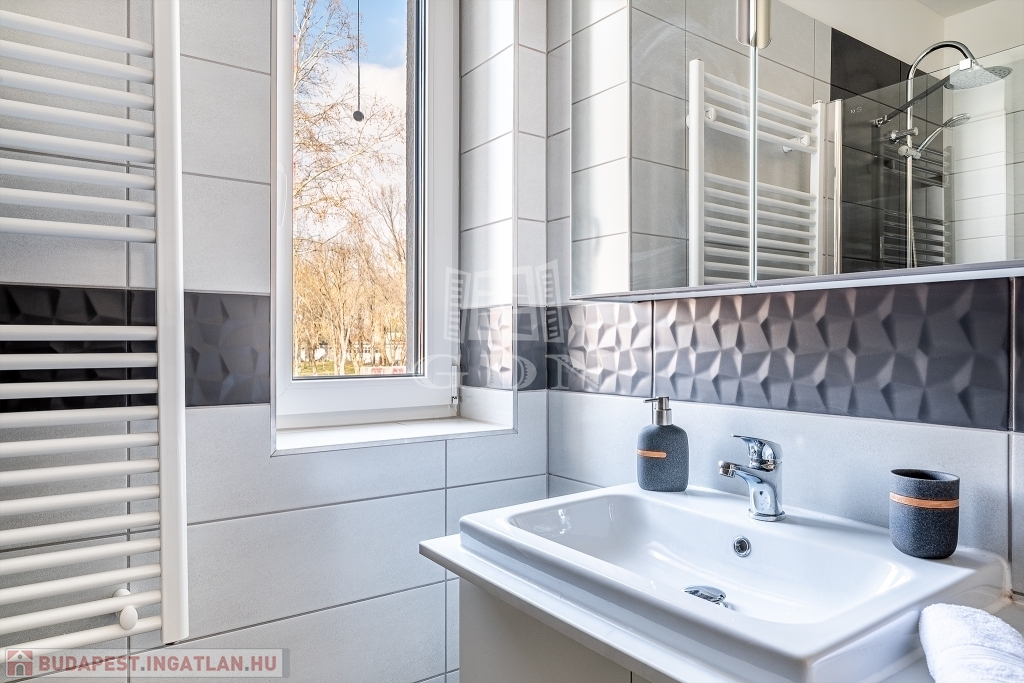 A fürdőszobában és a WC-ben hőszivattyús padlófűtés és elektromos törölközőszárító gondoskodik a komfortérzetről.