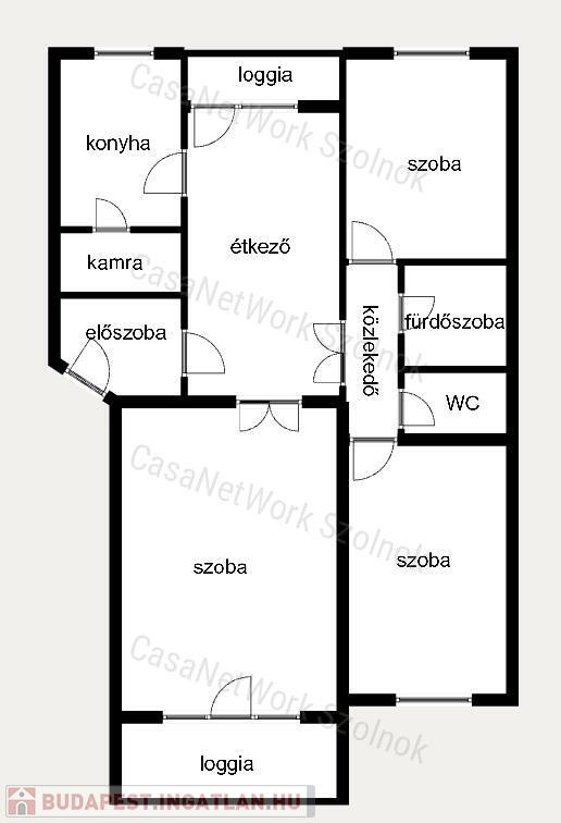 - három egész szoba, konyha, étkező, kamra, előszoba, közlekedő, fürdőszoba és külön WC alkotja