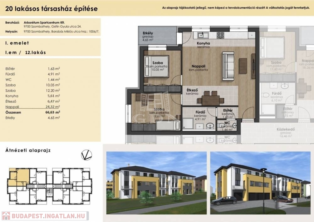 A három szintes kettő emeletes, 20 lakásos modern társasházak minden igényt kielégítő, magas műszaki tartalommal valósulnak meg. A kiváló tájolású 40-67 m2 közötti ingatlanokat nagyon jó elosztás és élhető terek jellemzik. A lakások nappali+egy , nappali +kettő szobásak lesznek. A földszinti lakások komfortérzetét teraszok, saját kertek az emeleti lakásokét jó méretű erkélyek fokozzák. Nyílászárói 3 rétegű fokozottan hő- és hangszigetelt üvegezésű műanyag ablakok és erkélyajtók, redőny fogadására alkalmas szemöldök kialakítással. A lakások bejárati ajtaja MABISZ minősítéssel rendelkező tömör, több ponton záródó biztonsági ajtó. Fűtése központi gázfűtés tervezett, kondenzációs gázkazánnal a lakásokban egyedi hőmennyiség szabályozással és mérővel, padlófűtéses hőleadással. Klímaelőkészítést a vételár magában foglalja. Hideg -meleg burkolatok ,szaniterek, csaptelepek, beltéri ajtók választhatók. Az ingatlanhoz felszíni parkoló, garázs vásárolható.