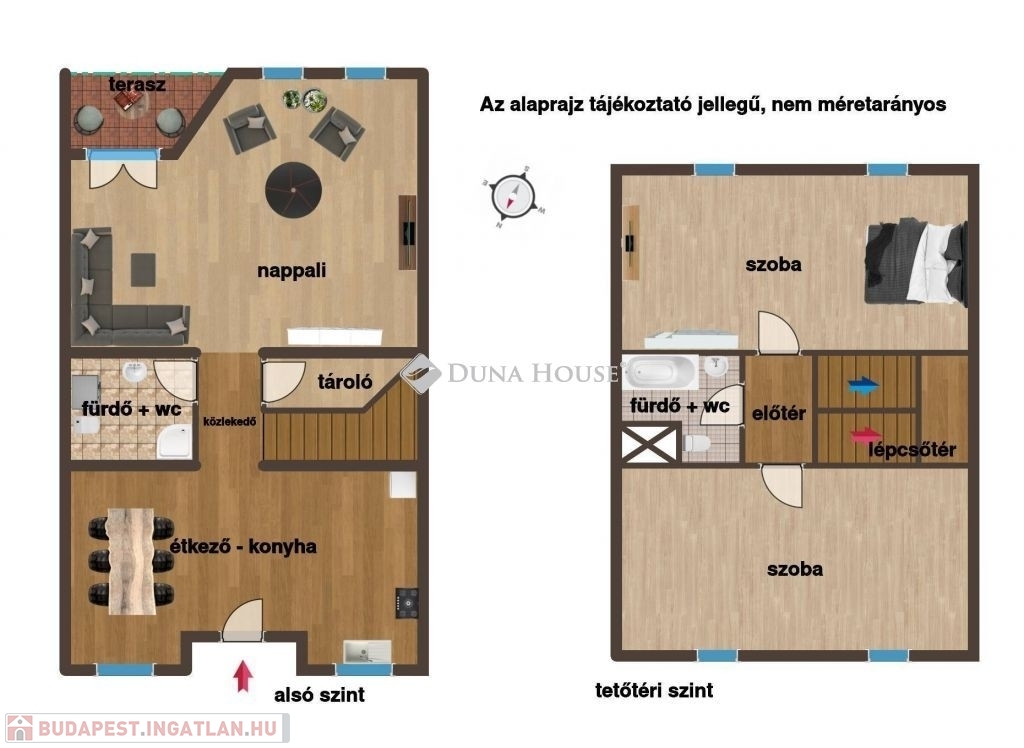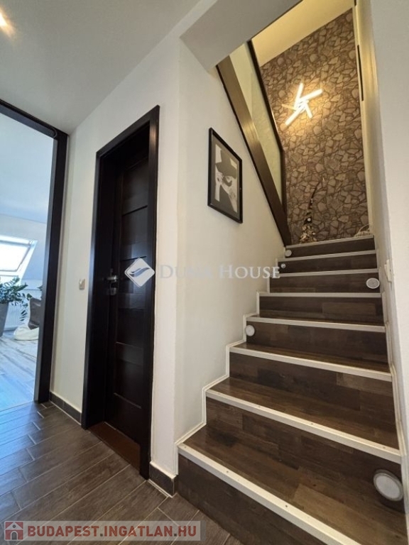 Az ingatlan egy tégla építésű, Kassák Lajos utcai társasház zárószínjén található. A kétszintes lakás alsó felébe egy tágas konyha-étkezőn keresztül érkezünk, amit egy kis közlekedő választ el a szintén tágas nappalitól. A déli tájolású nappaliból nyílik a fedett terasz. A közlekedővel szomszédos egy fürdő wc-vel, valamint a lépcső alá rejtett tároló helyiség. Az emeleten található még egy fürdő wc-vel, valamint két nagy méretű szoba van kialakítva. A modern megjelenésű, ízléses kialakítású lakást gondos tulajdonosai az elmúlt években is folyamatosan újították, hibátlan esztétikai és kiváló műszaki állapotban van.