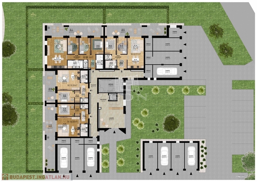 Modern megjelenésű, értékálló, kényelmes és élhető lakóparkban valamint az épületekhez kapcsolódó egyedi lakókörnyezetben szeretne élni? Hamarosan megvalósulhat az álma. A Gyöngyös-patak partján belváros közeli prémium lakások épülnek 20 000 m2-es területen, több ütemben. A tervezés során a funkció, a környezettudatosság és a kényelem voltak a legfontosabb tervezési szempontok. Így különösen az épületek szellős elhelyezése, a lakások kedvező tájolása, az épületek körül a maximális zöldterület és a megfelelő garázs szám biztosítása, a színvonalas közösségi funkciók kialakítása. A lakások értékállóságát és kényelmét az átgondolt tervezés, a minőségi anyagok használata, a nagyméretű, intim teraszok, a lift, a megújuló energia, egyedi és közös tárolók, fedett beállók, garázsok biztosítják. Az alkalmazott szerkezetek megfelelnek a ma érvényes “közel nulla energiaigényű épületek” követelményeinek. Az épületek előtti sétányok díszkivilágítást kapnak mozgás- és alkonykapcsolás vezérlésével. A sétányokról különböző típusú gépkocsi beállóhelyek – felszíni fedett, és normál parkolók ill. garázsok - közelíthetők meg. Egyes parkolók között beruházói döntés szerinti helyen és műszaki kialakítással, elektromos töltőpont csatlakozási lehetőség biztosítható. A közös területek alkalmasak játékra, pihenésre, a földszinti lakások előtti kijelölt zöldterület saját használata mellett. A ház kaputelefon rendszerrel lesz felszerelve. A lépcsőházban és egyéb közös terekben légterenként időkapcsolós világítás lesz kiépítve. A mai korszerű követelményeknek, az épületek hő és hangszigetelése a vonatkozó szabályoknak maximálisan megfelel. A külső hőszigetelés vastagsága 16-20 cm. Az ablakok 3 rétegű üvegezéssel kiváló hőszigetelésű nyílászárók. A lakások padlófűtéssel rendelkeznek, mely a szabadabb belsőépítészeti kialakításoknak ad lehetőséget. A tervek szerint a központi gépészet távfelügyeleti rendszerrel ellátott, távfűtés, így a karbantartás és üzemeltetés során ez gyors beavatkozást és üzembiztonságot eredményez. A fogyasztás egyedi mérőkkel mért, az elszámolást a közös képviselő végzi. A megújuló energia tervek szerint a megfelelő energetikai szabályok alapján kerül telepítésre pl. napelemrendszer. (Kiviteli terv során változhat: kondenzációs gázkazán és/vagy hőszivattyú). Belsőépítész által tervezett lakások, nagy teraszokkal kapcsolódnak a természethez. Befektetőknek, nagy családoknak alkalmas lakások kerülnek kialakításra. A kisebb lakások 52 m2, 62 m2, a nagyobb lakások 67 m2, 76 m2 és 89 m2 nagyságúak lesznek. 12-33 m2 fedett intim teraszok kerülnek kialakításra. Aktuális, bevezető ajánlatban az 1db felszíni parkolót, vízlágyító rendszert, klíma előkészítést ajándékba adja a beruházó. A lakásokhoz tárolók, garázsok vásárolhatók. Kimerítőbb tájékoztatást személyesen. A hírdetésben szereplő lakás földszint 4.