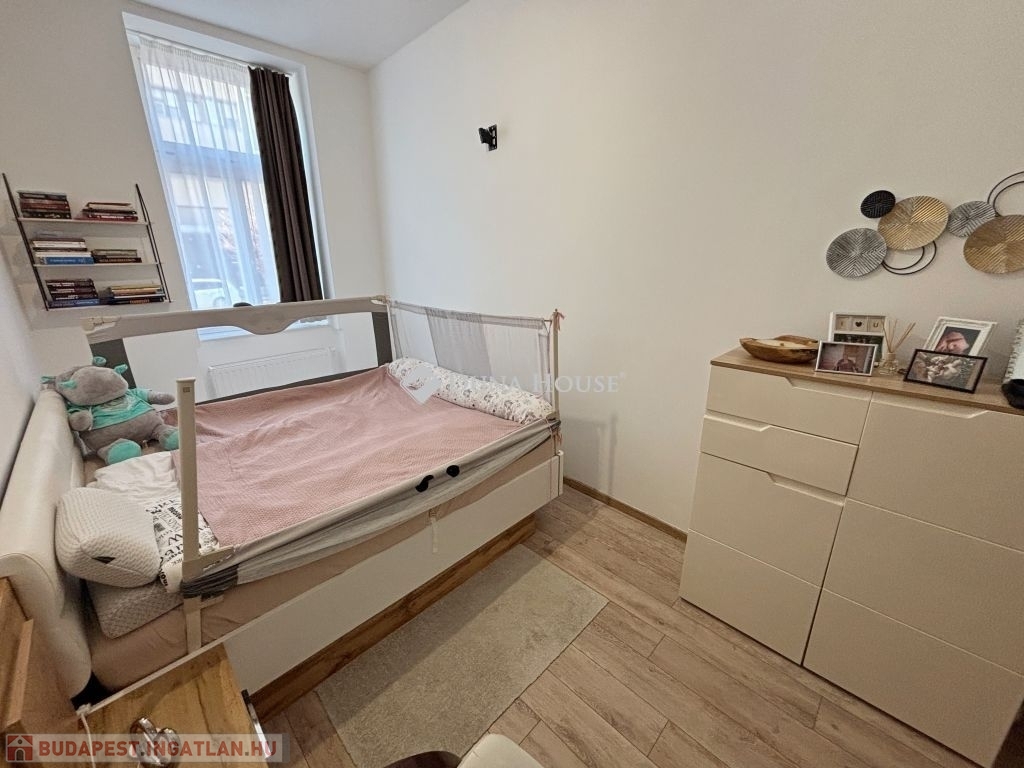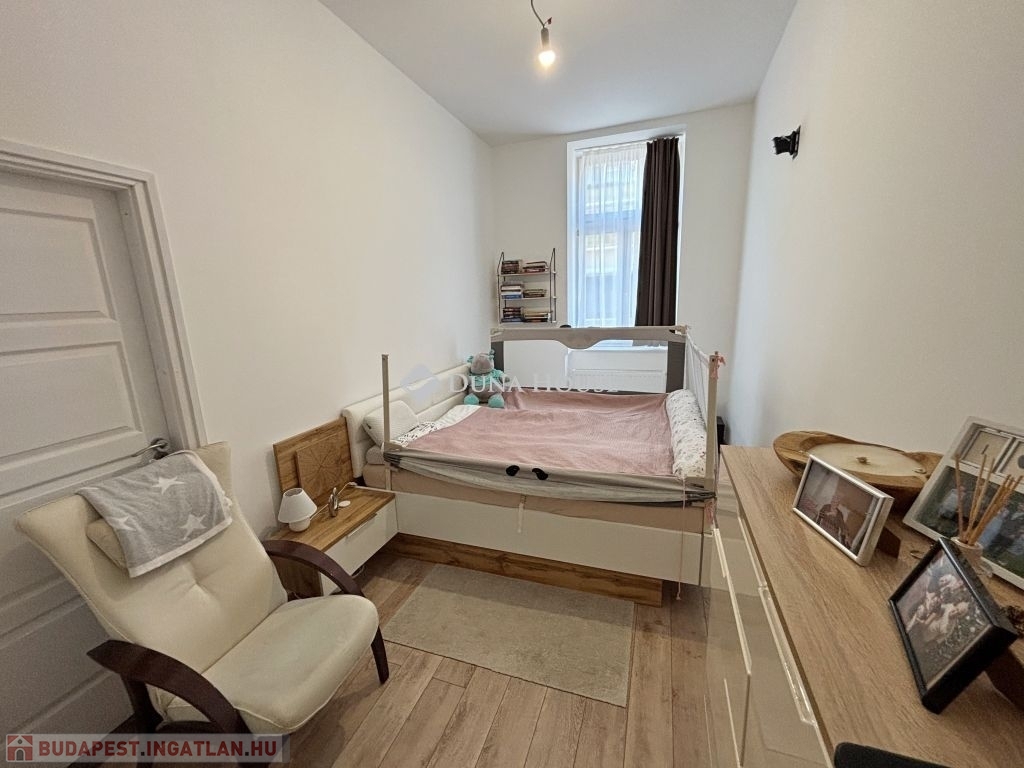 A lakásba a kapuszínből jutunk be, előszobájából nyílik a három utcafronti szoba, a fürdő-wc, a ház belső udvarára tájolt a konyha és a galériázott nappali, a galériából nyílik egy kisebb, zuhanyzós fürdő-wc. (összesen 80 m2 + a galériaszint). Az ingatlan 2010 és 2015 között teljes felújításon esett át, műszakilag is korszerűsítve lett, esztétikailag is hibátlan állapotban van. Fűtését gáz-cirkó kazán biztosítja, alternatívaként hűtő-fűtő klímaberendezést is felszereltek.