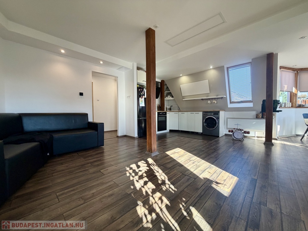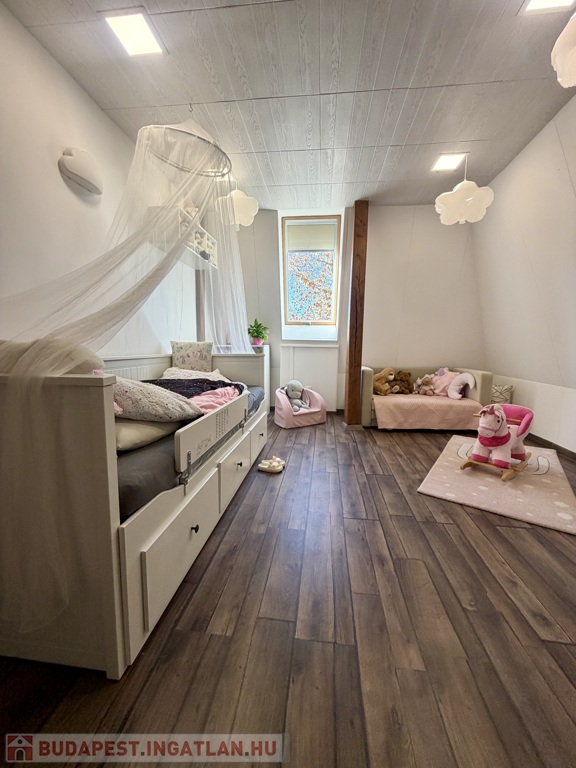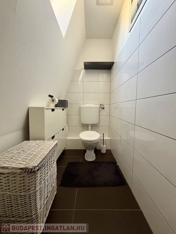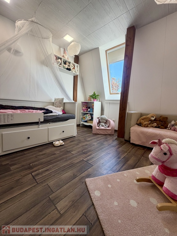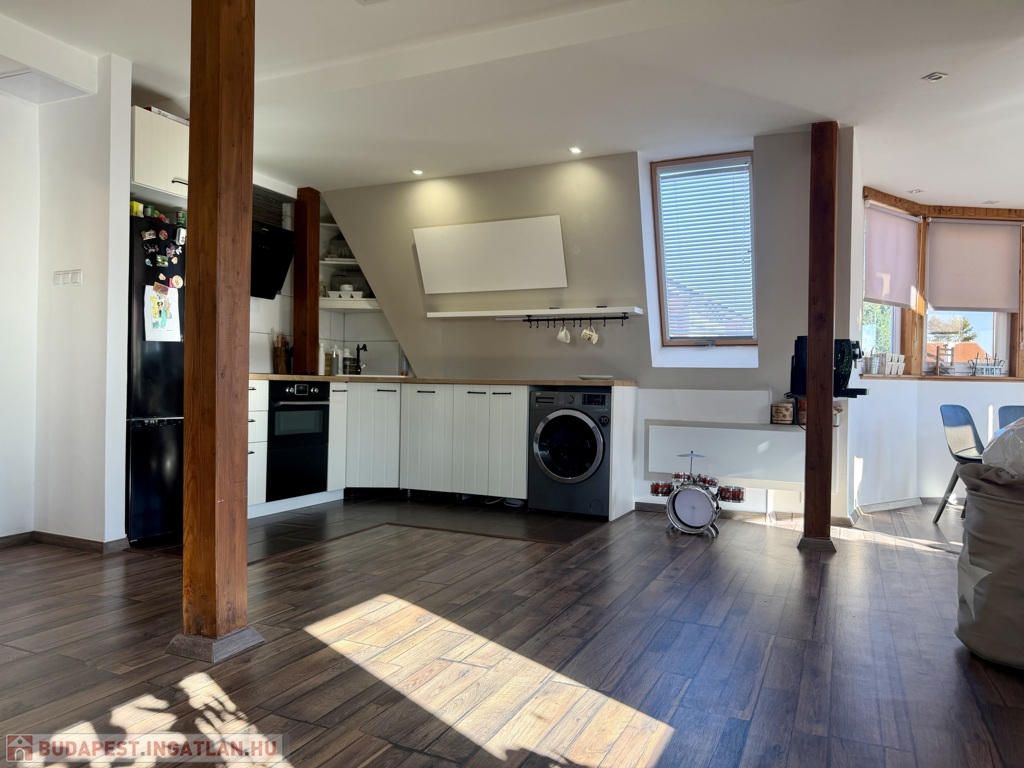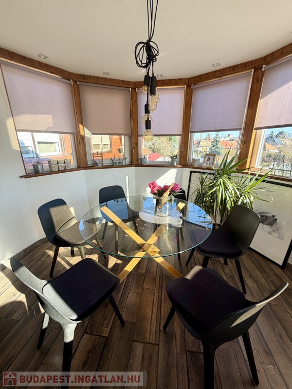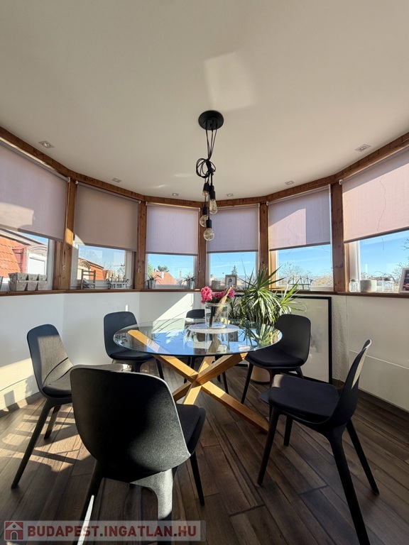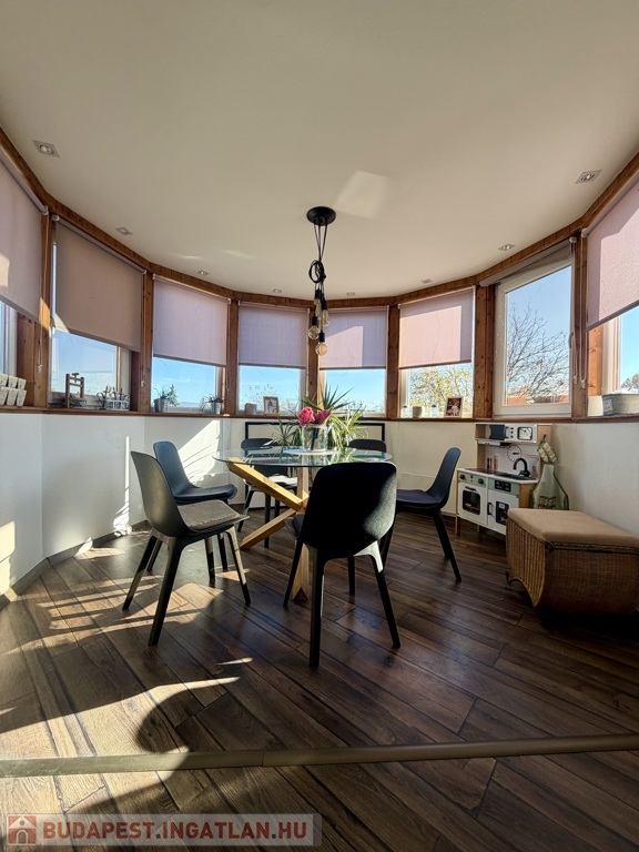A hálószobából egy kis erkély is nyílik, a nappali-étkező rész pedig a lakás igazi különlegessége – egy toronyszerű, körbenapozott toronyszerű étkezőrész, amely egyedi karaktert és meleg, barátságos hangulatot ad az egész otthonnak.