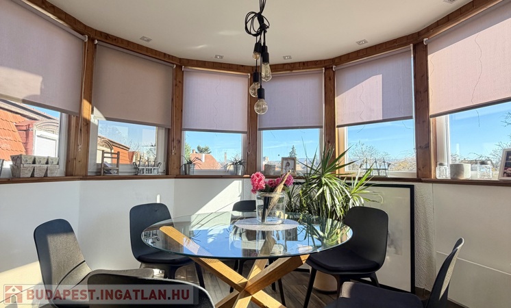 egy körbenapozott, toronyszerű étkezőrész, amely különleges karaktert ad a térnek, és igazán egyedivé teszi az ingatlant.