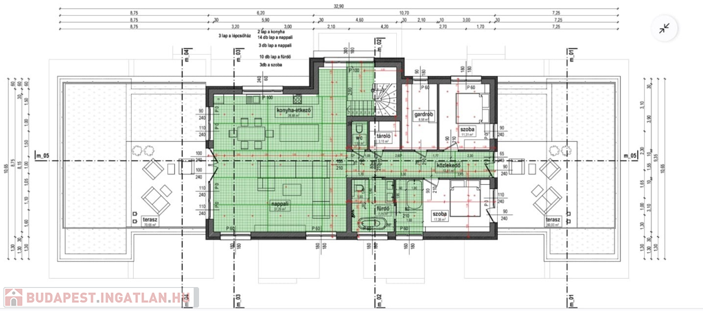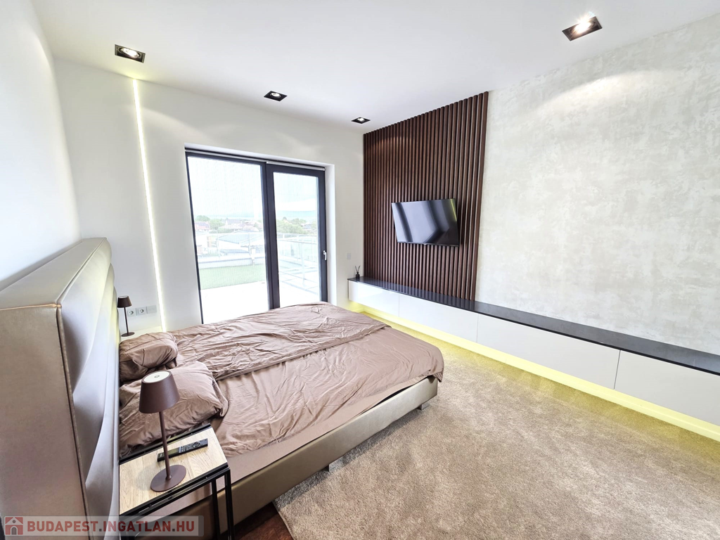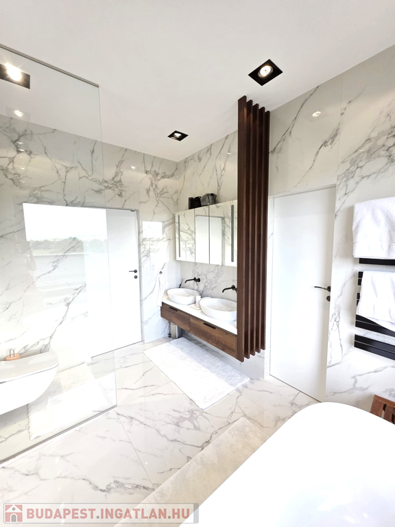 -2 hálószoba, 1 gardróbszoba, mosókonyha, tároló, külön fürdőszoba és mellékhelyiség, nappali, konyha, étkező egy légtérben.