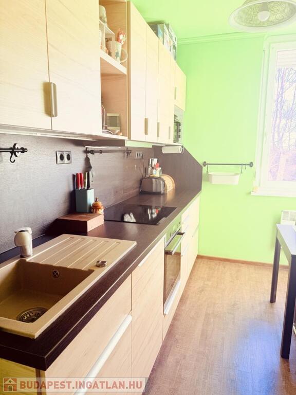 A konyhába igényes, beépített konyhabútor került Electrolux konyhai gépekkel, kivezetett szagelszívóval. A melegburkolatos helyiségekben vinyl burkolat, az egész lakásban új beltéri ajtók kerültek beépítésre.