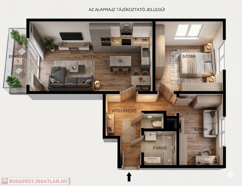 Ahogy belépünk a lakásba, egy tágas, járólappal burkolt előszoba fogad minket, amely kényelmes átjárást biztosít az összes helyiséghez. A szobák külön nyílnak és laminált parkettával burkoltak, meleg és otthonos hangulatot árasztanak. A lakás 22nm amerikai konyhás nappalival büszkélkedhet.