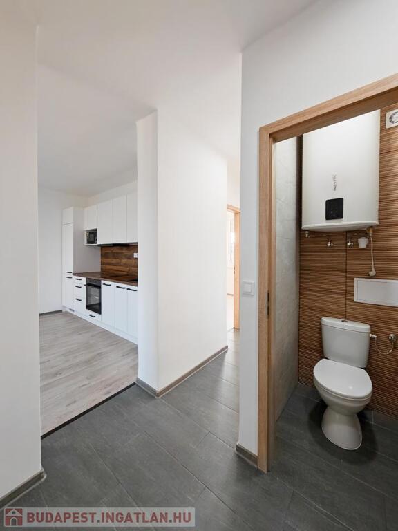 A fürdőszoba és a WC külön helyiségben található, mindkettő járólappal és csempével borított, modern megjelenést és praktikus elrendezést biztosítva.