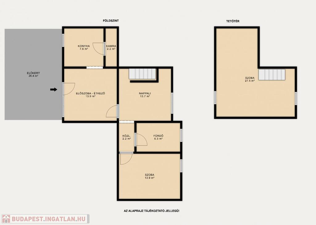 Alapterület: 60 m² földszint + 26 m² beépített tetőtér