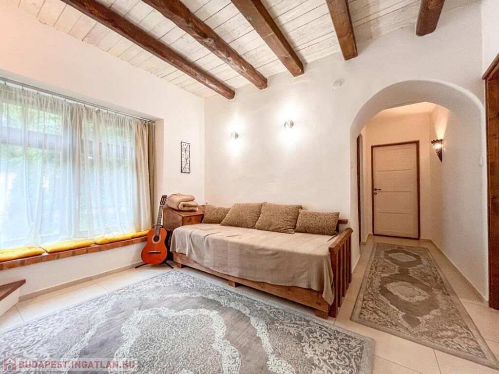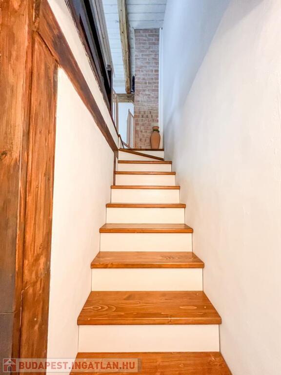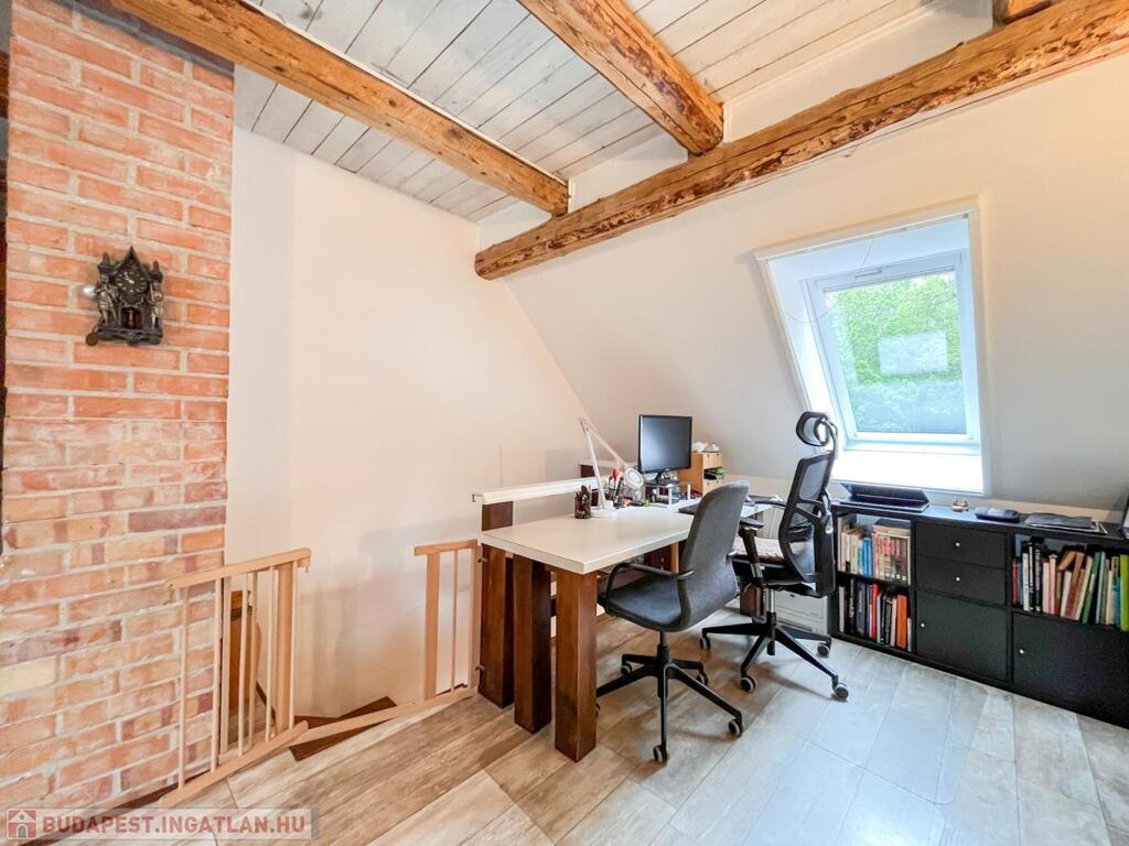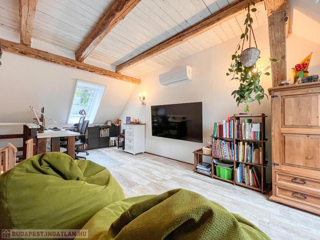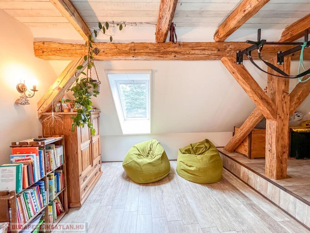 A tetőtér beépítésekor megmaradt az eredeti, karakteres fagerendás födém, amely esztétikai és történeti értéket képvisel.