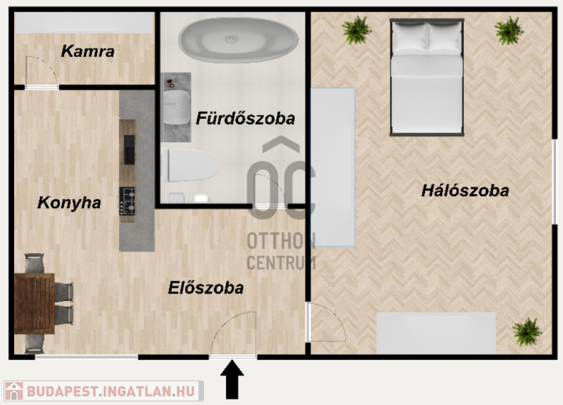 Elosztása: előszoba, tágas szoba, fürdőszoba WC-vel, konyha, kamra (spejz)