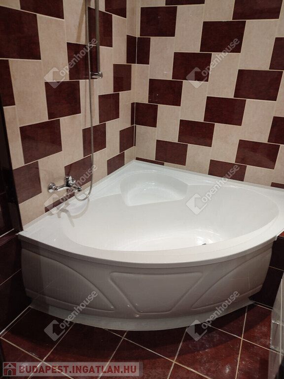 -A fürdőszoba sarokkáddal szerelt, a toalett külön helyiségben található.