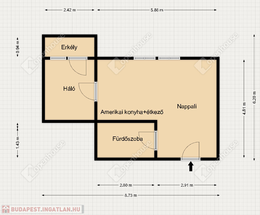 - 38 nm, 1+1 szoba, amerikai konyha nappalival