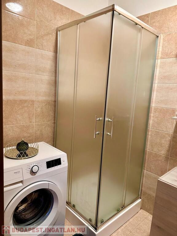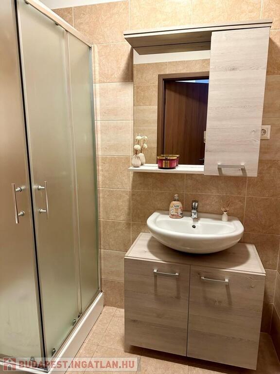 a fürdőszoba igényes burkolatokkal, zuhanykabinnal került kialakításra.