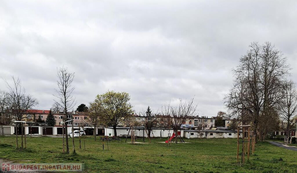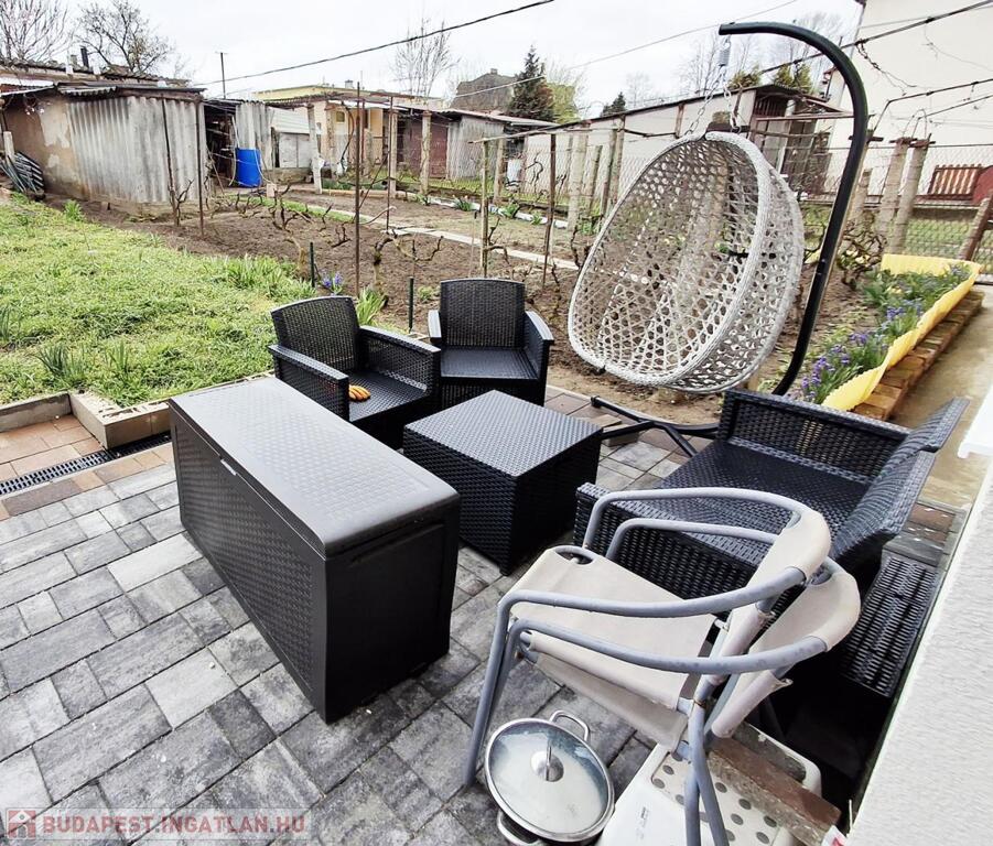Az ingatlanhoz tartozik egy saját használatú kertrész, amely a teraszról is közvetlenül megközelíthető, valamint egy nagyméretű mobilgarázs, amely kerti tárolóként funkcionál.