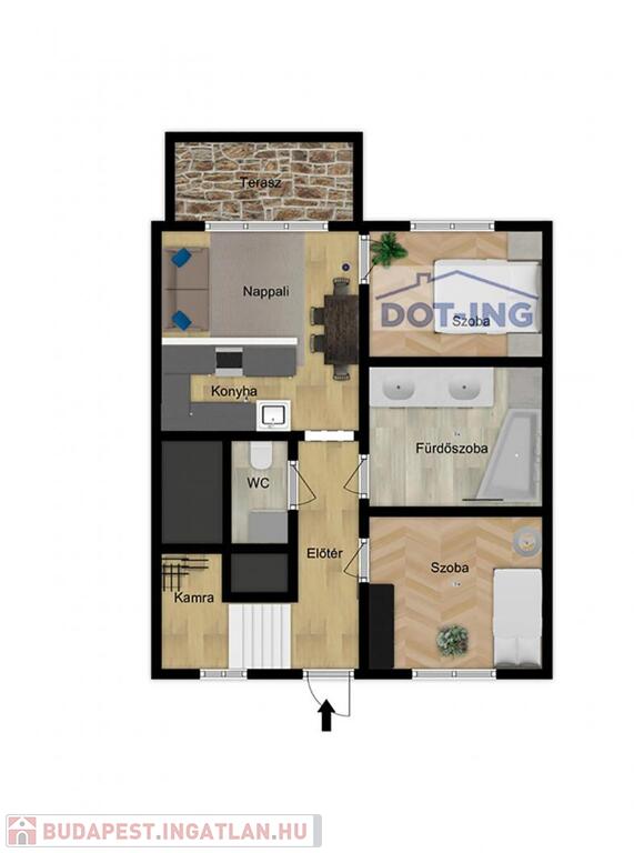 Tatabánya Kertváros csendes utcájában, 4 lakásos társasház földszintjén eladó egy 44 nm-es felújított, 2,5 szobás lakás, melyhez terasz és saját közvetlen kertkapcsolat is tartozik.