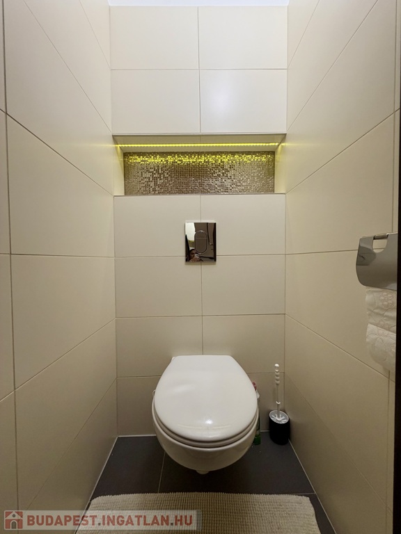 A fürdő és a WC külön helyiségben található, mindkettő modern burkolatokkal, Grohe-szerelvényekkel, a szellőzés elektromos vezérléssel lett megoldva.